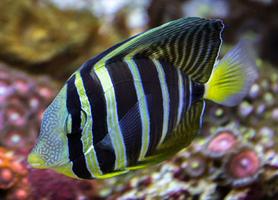 - Iconic reef fish with striking black, white, and yellow bands.